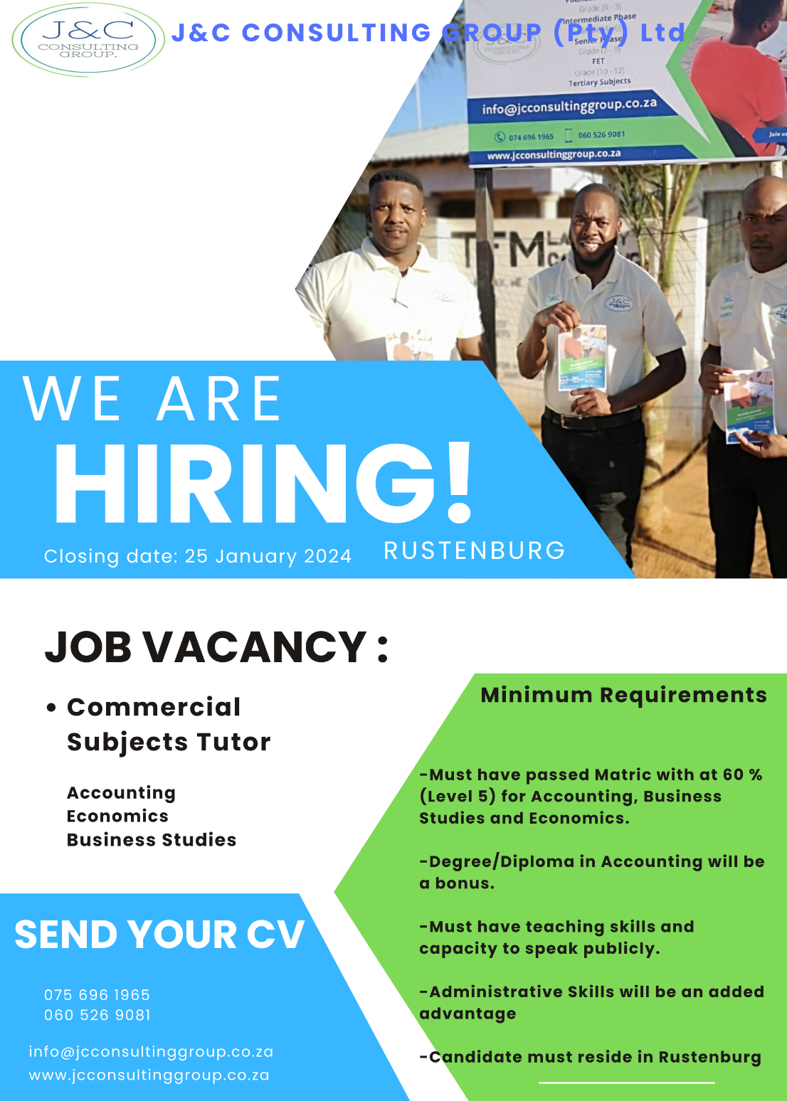 We are seeking a highly motivated commercial subjects tutor. Tutor must be able to teach accounting, business studies and economics. The successful candidate will be responsible for extra classes and one on one tutoring with the students.